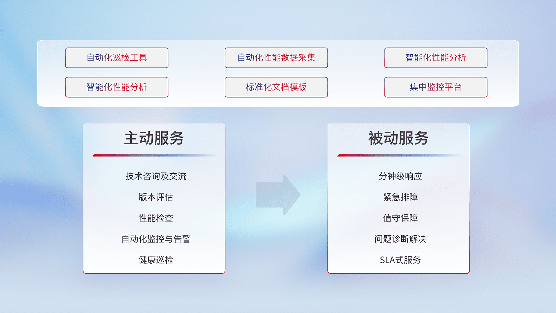 智能化工具和标准化文档,,,保障服务质量,,,提供主动服务(包含技术咨询、、、版本评估、、、性能检查、、、、自动化监控与告警、、健康巡检)和被动服务包含(分钟级响应、、、、紧急排障、、、值守保障、、、问题诊断解决、、SLA服务)。。