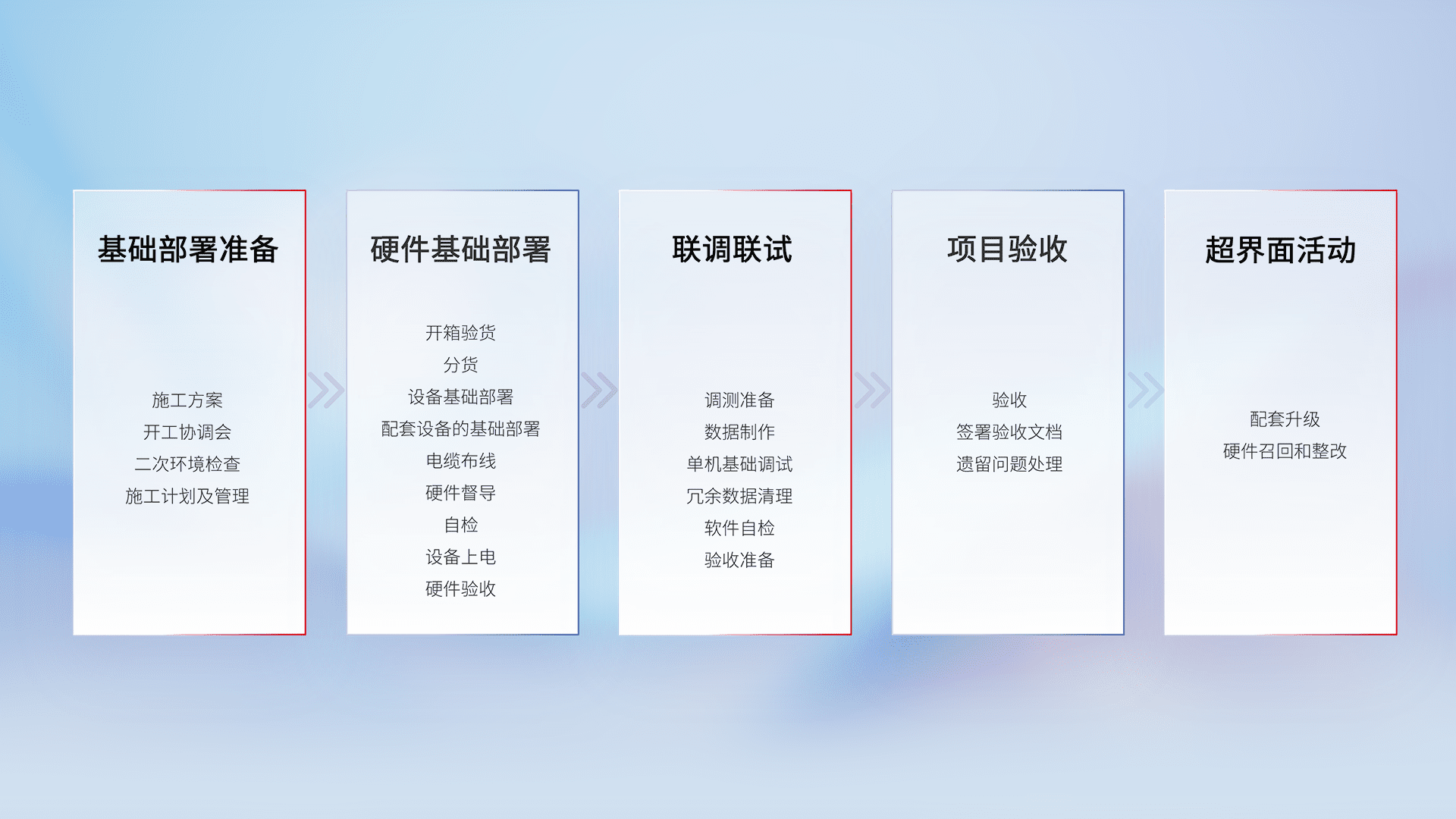 从基础部署准备、、硬件基础部署、、、联调联试、、、项目验收、、、、越界面活动的全过程可追溯,,,,保证施工质量和进度。。。。